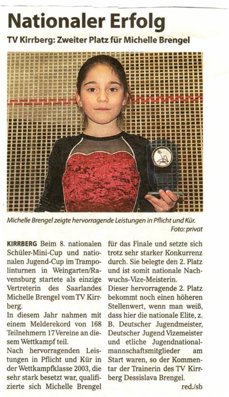 Im Rahmen des Deutschen Turnfestes in Frankfurt gewann Elina Muschinka, die derzeit erfolgreichste Turnerin des TV 06 Kirrberg, den Titel der Deutschen Mehrkampfmeisterin in der Wettkampfklasse 14/15.