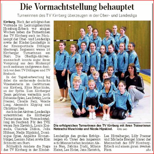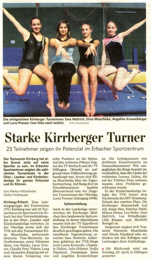 Am 18.03. 2012 erreichten die Turnerinnen des TV06 Kirrberg in Erbach bei den Turnwettkämpfen in der Landesliga Sara Hettrich einen hervorragenden 2. Platz und Angelina Kronenbürger einen ebenso hervorragenden 3. Platz.