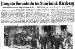 Dieser auf Dauer untragbare Zustand wurde aufgehoben, als die Menschen in Kirrberg bei der Volksabstimmung am 23.04.1949 mit einer überwältigenden Mehrheit für die Rückangliederung an das Saarland stimmten. Als am 24.04.1949 am Grenzposten hinter dem Landeskrankenhaus (Anstaltstor) das Protokoll unterschrieben wurde, war Kirrberg mit seinen damals 1860 Seelen offiziell als letzte Gemeinde an das Saarland angegliedert.
